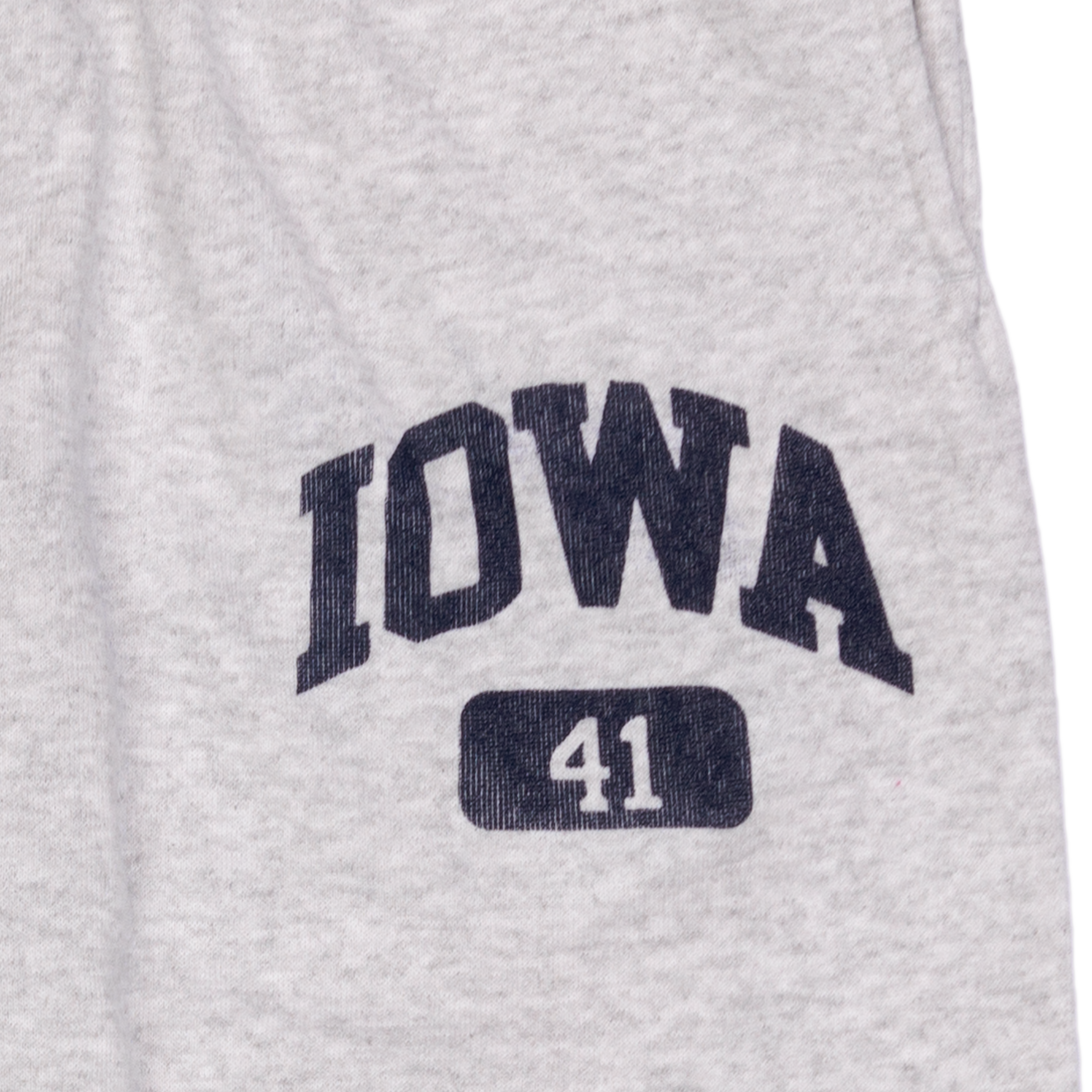 Classic heather grey brushed fleece sweatpants with an elasticated cuff and a hand printed collegiate inspired ''IOWA'' graphic. These super-comfy sweatpants are treated with wash effect for a unique vintage look.
