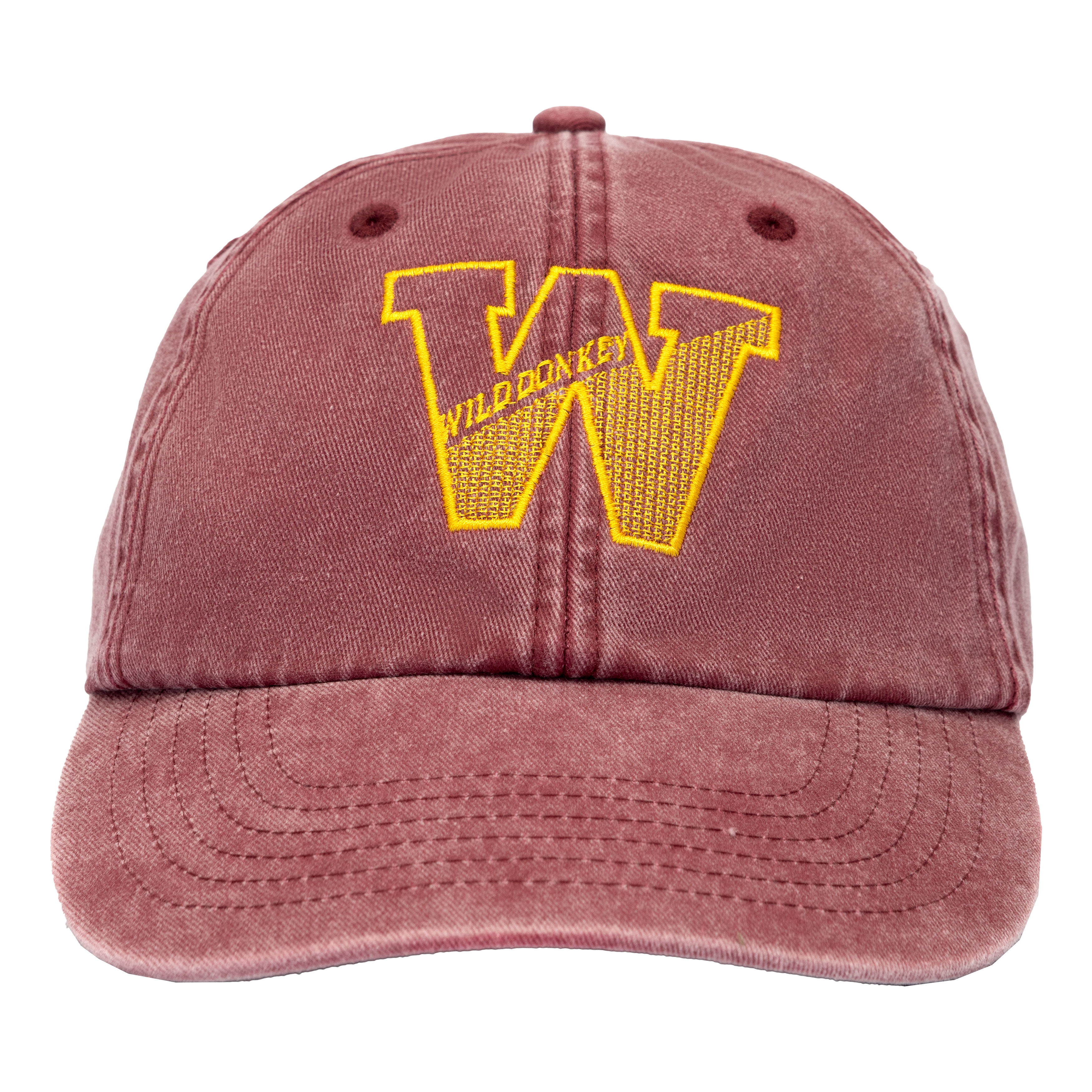 This vintage red, 100% cotton ''dad-style'' cap features an embroidered collegiate take on our Wild Donkey logo.